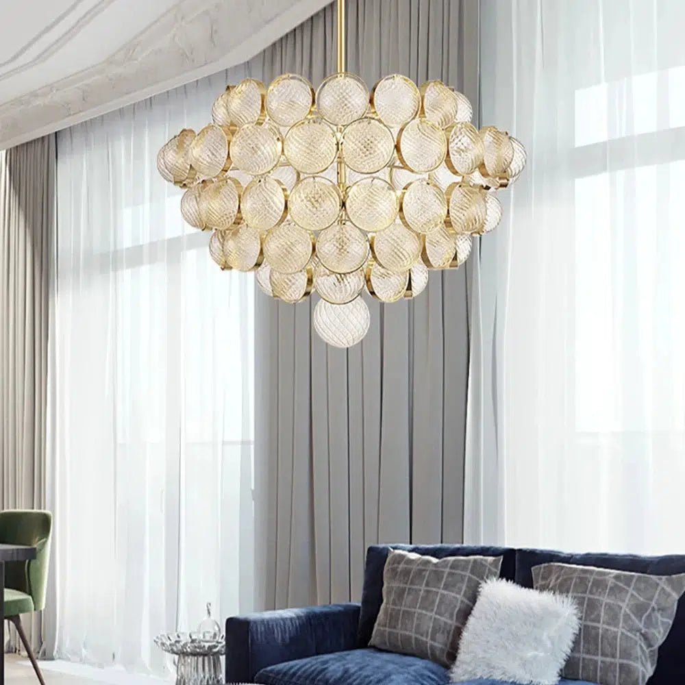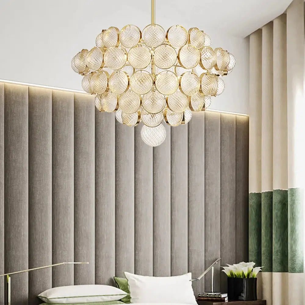Die Glaskugeln reflektieren das Licht auf sanfte Weise und tauchen den Raum in ein warmes und einladendes Licht, wodurch das Ambiente an Eleganz und Stil gewinnt.