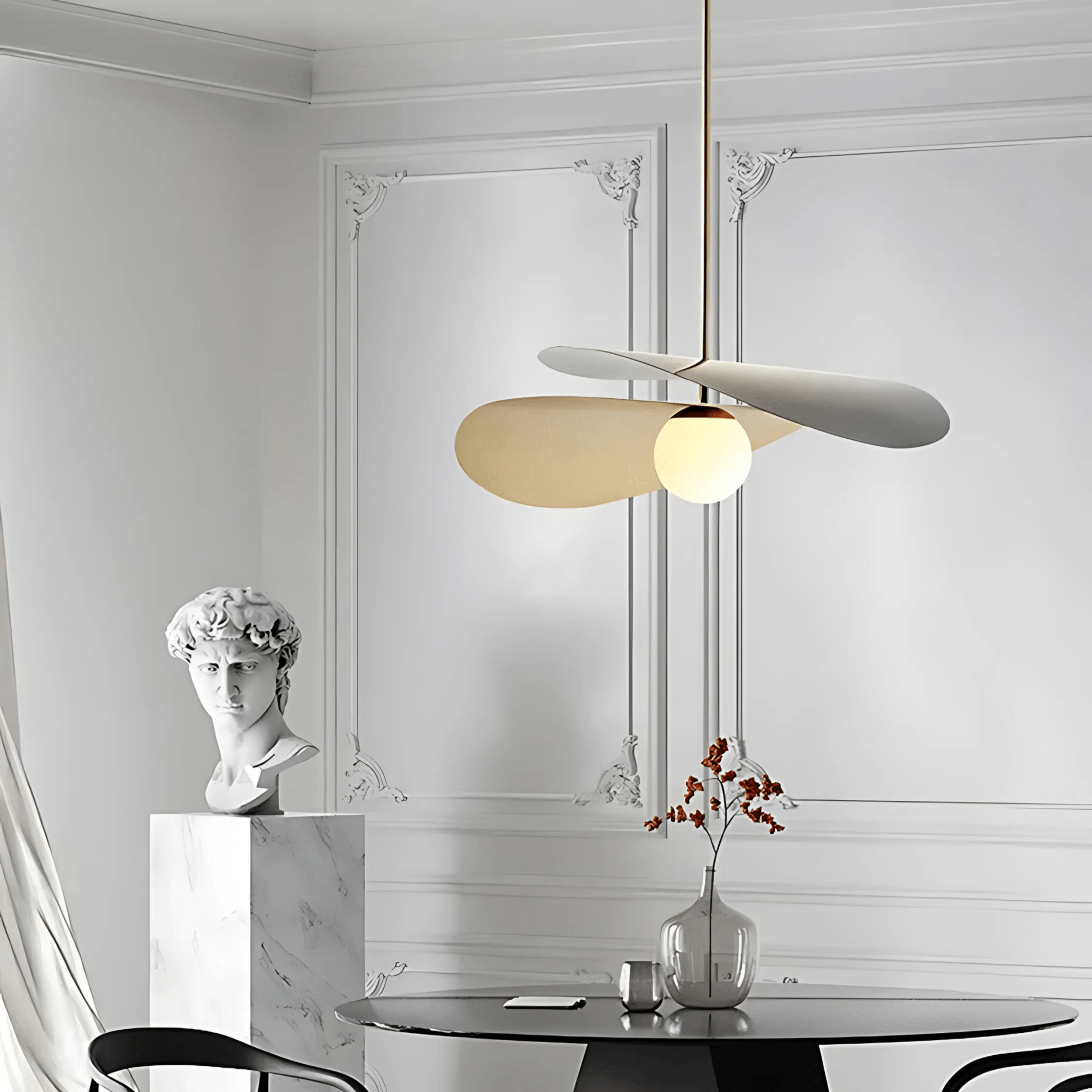 Αυτό το κρεμαστό φωτιστικό αποτελείται από δύο ασύμμετρες, καμπύλες αποχρώσεις που επικαλύπτονται με χάρη, σχηματίζοντας μια δυναμική σιλουέτα που προσθέτει μια αίσθηση κίνησης σε κάθε χώρο.