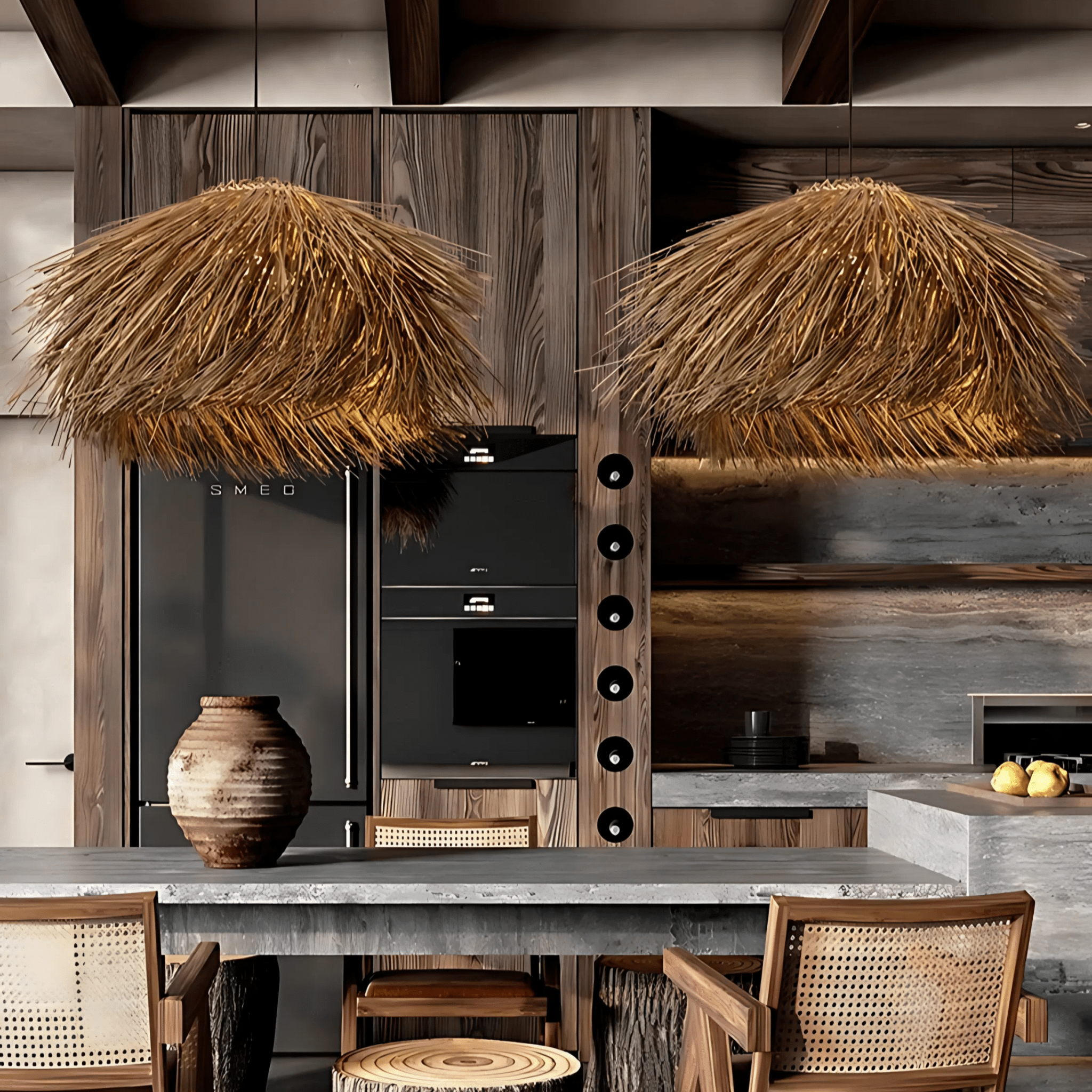Cada hebra está tejida meticulosamente, creando una pantalla que filtra la luz maravillosamente, proyectando patrones cálidos y moteados que aportan un brillo suave y acogedor a cualquier espacio.