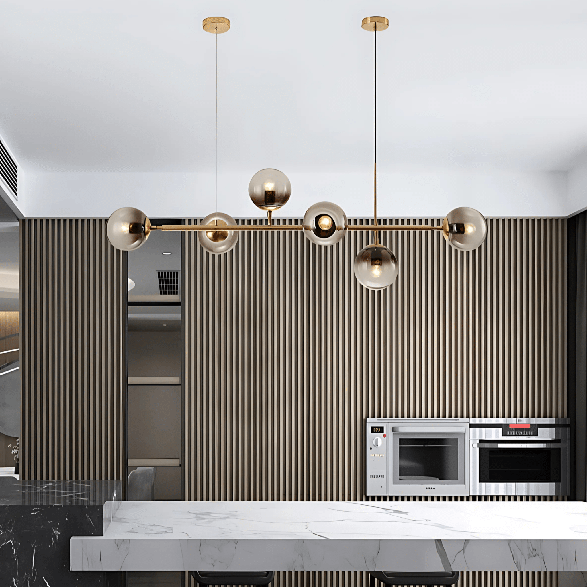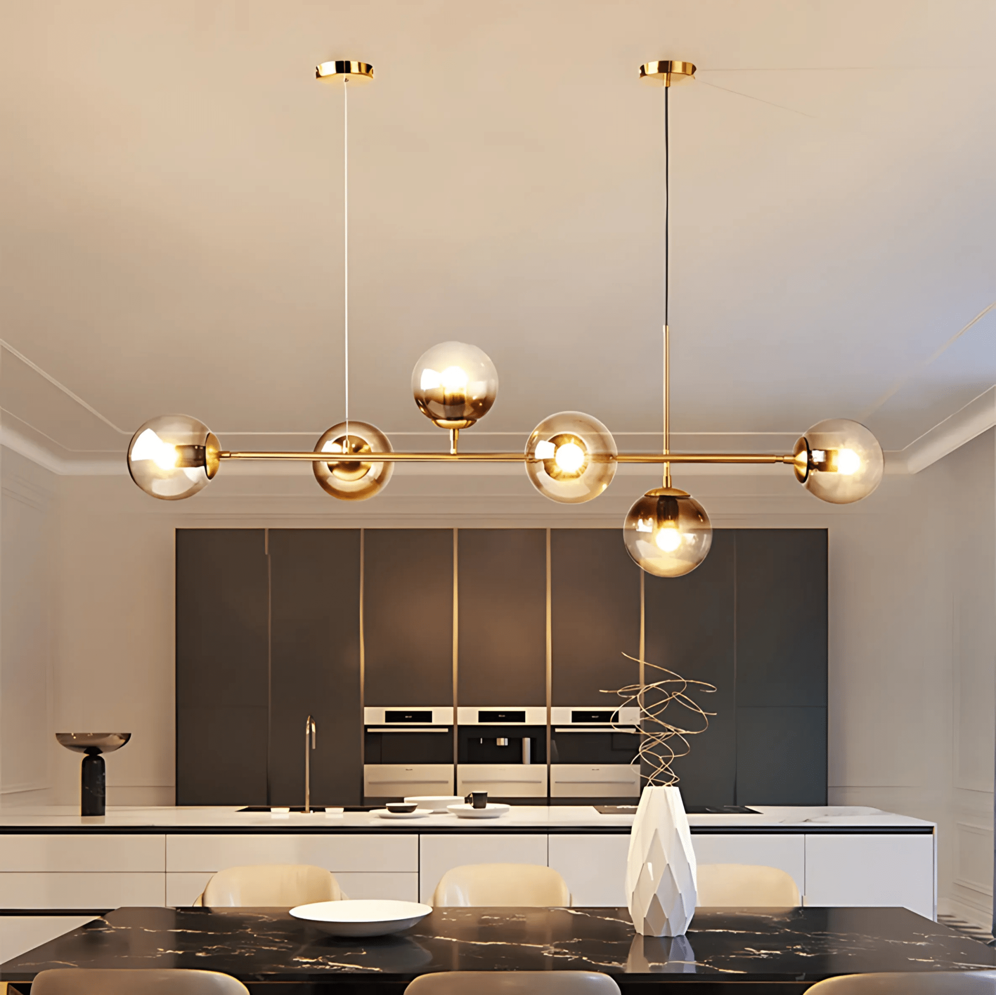 La collection Erica se décline en version suspendue horizontale ou verticale. La version horizontale est idéale pour les tables à manger et les îlots de cuisine, diffusant une lumière élégante et allongée sur vos réceptions.