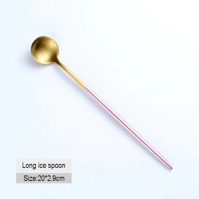 IL Rosa + Il set di posate dorate è un'aggiunta moderna ed elegante a qualsiasi tavolo da pranzo. Il set è caratterizzato da un design elegante, rosa maniglie con una finitura liscia e opaca che contrasta magnificamente con il opaco teste in acciaio inossidabile dorato.